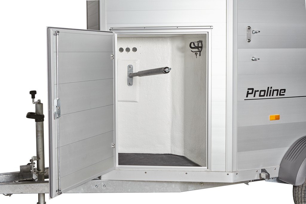 Als aanvulling op de standaardeigenschappen zijn voor uw 2 paardsaanhanger uiteenlopende extra’s verkrijgbaar. Het standaardmodel van de Proline Chamonix beschikt bijvoorbeeld niet over een aparte opslagruimte. Indien gewenst is een 2 paards trailer daarom met een zadelkamer aan de voorkant uit te breiden. Behalve zadels zijn hierin bijvoorbeeld zadeldekken, hoofdstellen, rijlaarzen en kleding in op te bergen. Wij kunnen de zadelkamer eveneens voorzien van binnenverlichting en meerdere uitschuifbare zadelsteunen. Als u tijdens de rit wilt weten of het goed gaat met uw paarden, is een camera een onmisbaar hulpmiddel. Deze wordt hoog in de bak geïnstalleerd. Het beeld wordt naar uw smartphone of tablet verzonden, zodat u live kunt zien hoe de situatie binnen is. Wanneer u de Chamonix 2 paards ook wel als veewagen gebruikt, kunt u er hekken voor de oploopklep bij kopen. Hiermee laten schapen zich gemakkelijker in de bak leiden. Tot de verdere optionele onderdelen behoren onder meer velgen en een SCM-gekeurd antidiefstalslot voor op de koppeling. Houd er rekening mee dat het eigen gewicht van een paardentrailer met 2 paarden met elke uitbreiding toeneemt.