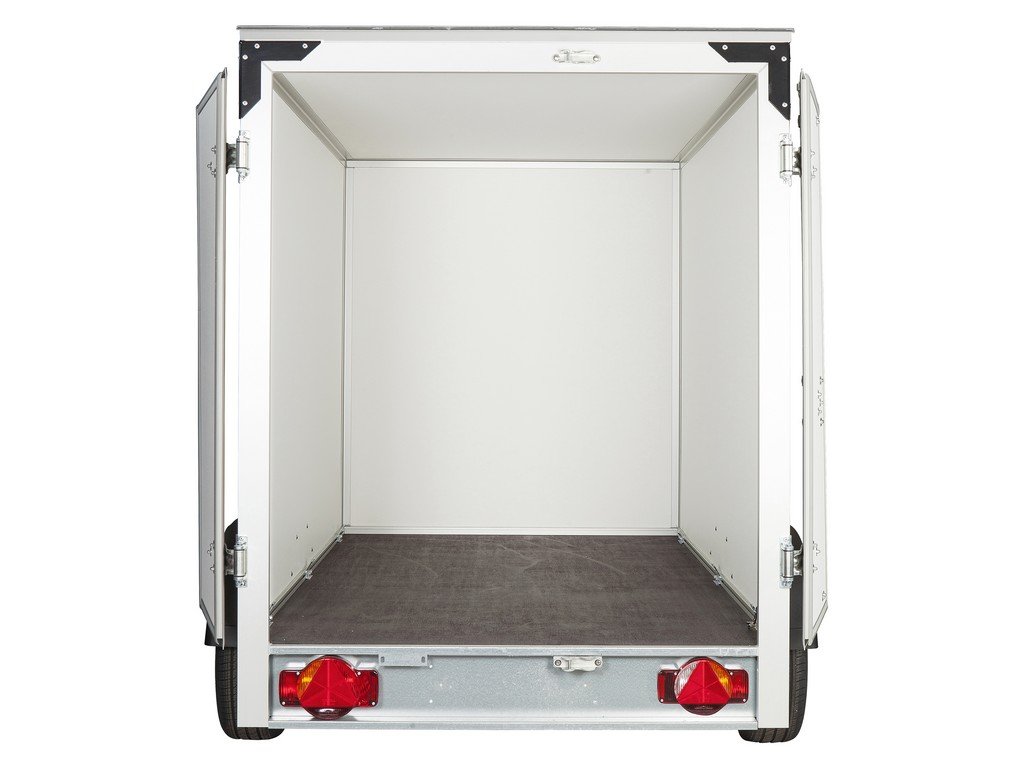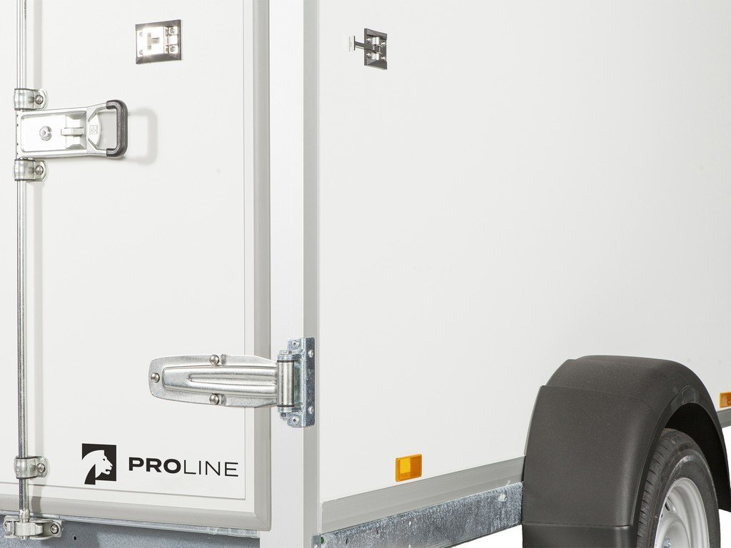 Welk model uw voorkeur ook heeft, u koopt altijd een goed uitgeruste gesloten Proline-enkelasser. De bak is opgebouwd uit hoogwaardige materialen, waaronder kunststof sandwich-panelen en aluminium profielen. Een voordeel van dit materiaal is dat u een gesloten enkelas aanhangwagen koopt die robuust en onderhoudsarm is. De hoeken van de sandwich-opbouw zijn aan de buitenzijde extra verstevigd. Aan de achterzijde van de dichte aanhanger enkelasser bevinden zich twee geheel opslaande deuren. Op de randen daarvan is Hertel-rubber aangebracht, zodat water en vocht niet kunnen binnendringen. Hertel-rubber heeft als pluspunt dat het onder alle omstandigheden flexibel blijft en dus steeds voor een goede afsluiting zorgt. De deuren zijn voorzien van een geïntegreerd slot en vastzetters, waarmee u ze bij het laden en lossen veilig in de houders op de buitenwanden kunt klemmen. Om ladingen op hun plaats te houden, zijn in de binnenwanden sjor- en bindogen gemonteerd. Verder heeft elke dichte enkelasser in het Proline-aanbod binnenverlichting. Wanneer u specifieke accessoires wilt toevoegen kan dit vanzelfsprekend worden geregeld, en ook een enkelas aanhangwagen met maatwerk is mogelijk.